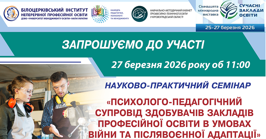27 березня 2026 року об 11:00 у рамках ХVІI Міжнародної спеціалізованої виставки «Сучасні заклади освіти – 2026» на базі Білоцерківського інституту неперервної професійної освіти спільно з...