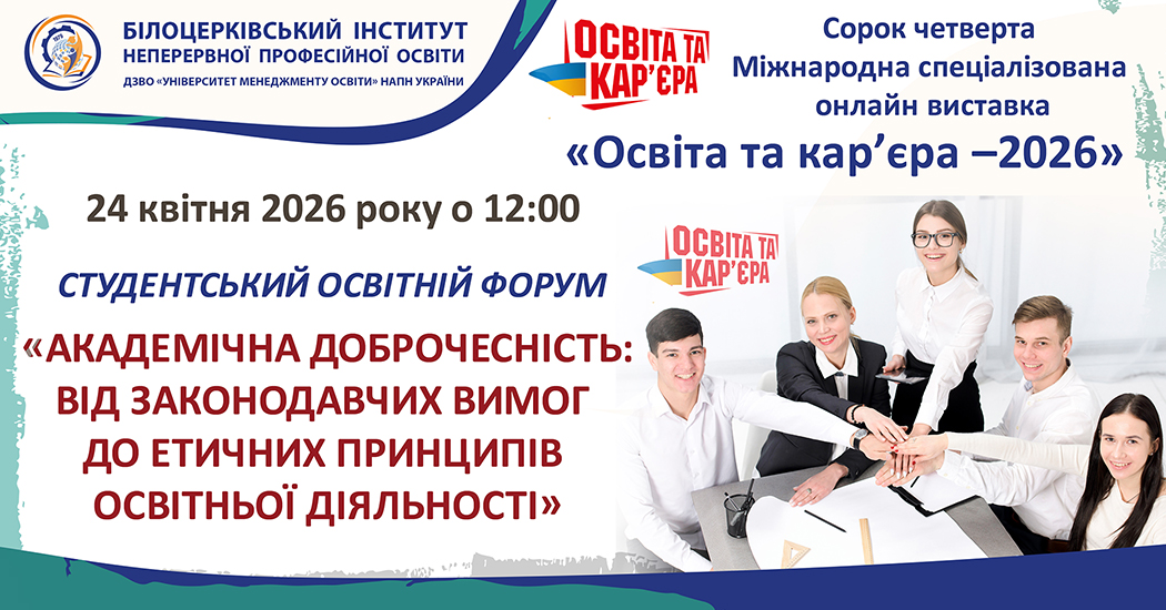 24 квітня 202 року о 12.00 у рамках Сорок четвертої Міжнародної спеціалізованої виставки «Освіта та кар’єра – 2026» Білоцерківський інститут неперервної професійної...