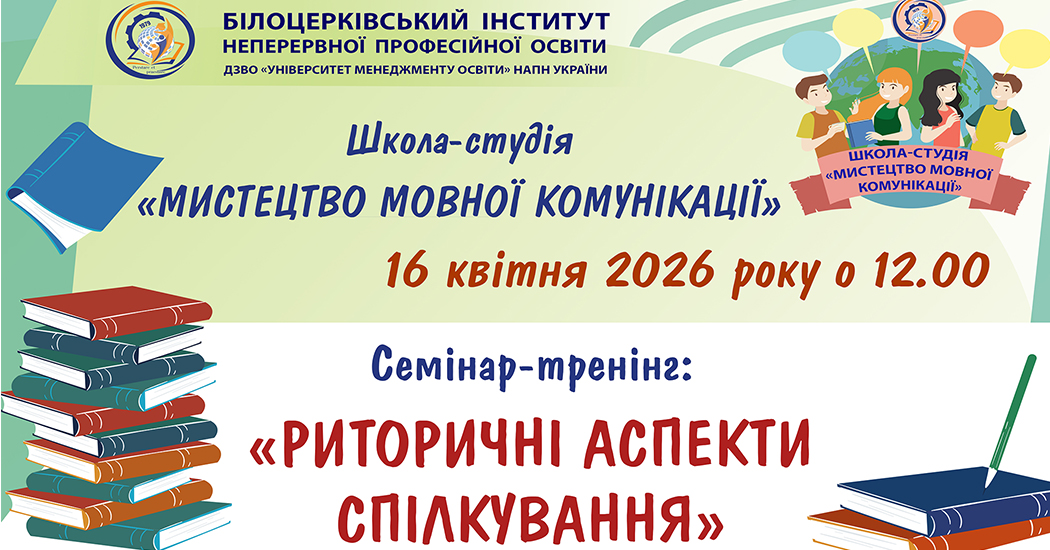 16 квітня 2026 року о 12.00 Білоцерківський інститут неперервної професійної освіти ДЗВО «УМО» НАПН України запрошує на семінар-тренінг: «Риторичні аспекти спілкування» у рамках засідання...