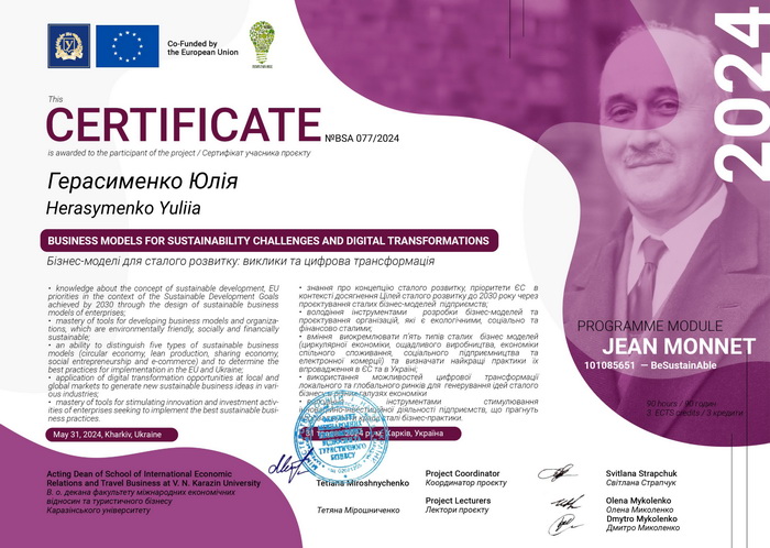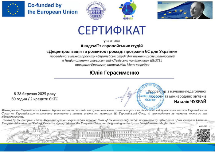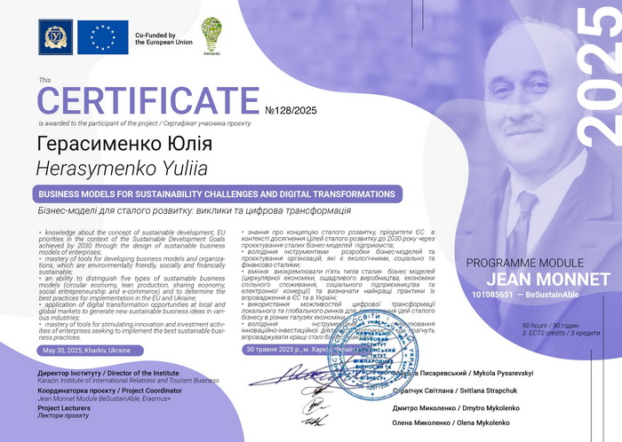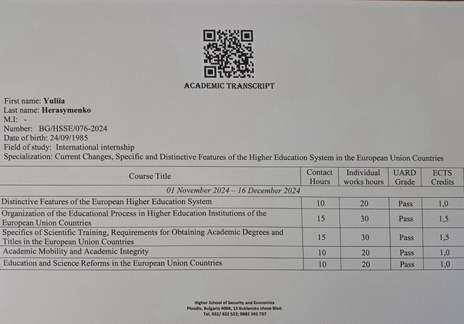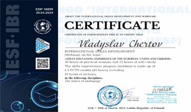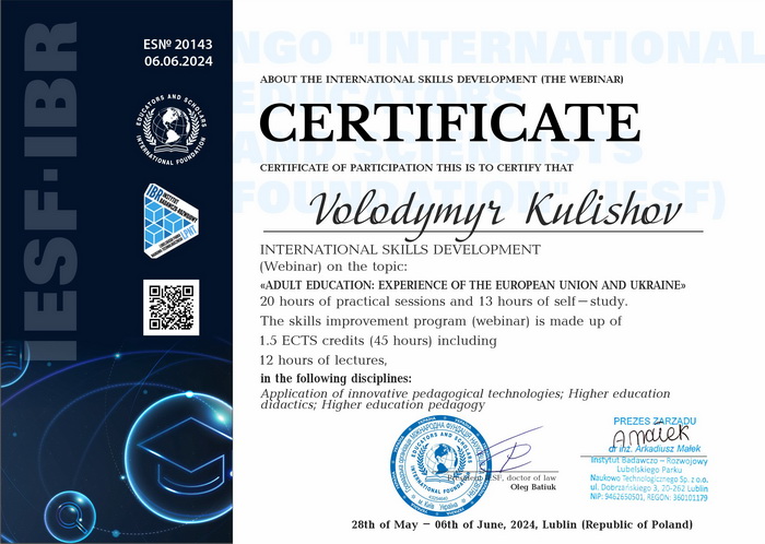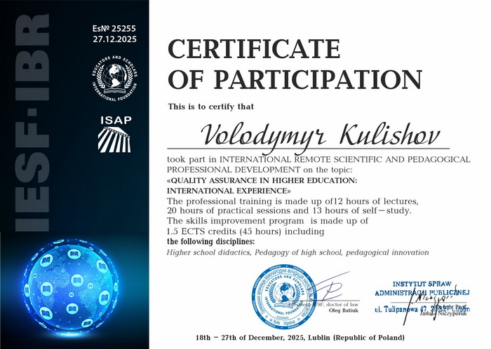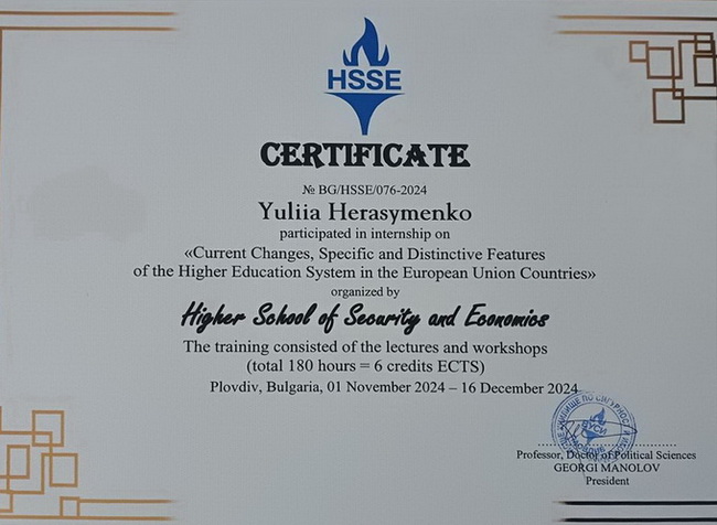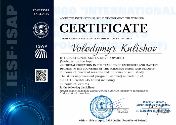 Із 20 по 27 лютого 2023 року 5 науково-педагогічних працівників кафедри пройшли міжнародне підвищення кваліфікації на тему «Неформальна освіта при підготовці бакалаврів в країнах Європейського Союзу та Україні» та отримали відповідні сертифікати об’ємом 45 год. / 1,5 кредита ECTS. Учасники стажування: доц. Володимир Кулішов, доц. Наталія Торба, доц. Ірина Кучерак, викл. Владислав Чертов, викл. Анна Кривобок.