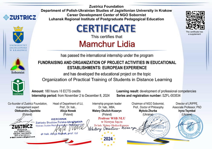 Із 16 по 23 травня 2022 року 10 науково-педагогічних працівників кафедри пройшли міжнародне підвищення кваліфікації з теми: «Використання можливостей хмарних сервісів в онлайн-навчанні для гуманітарних спеціальностей з використанням платформ Zoom та Moodle» (м.Люблін) та отримали відповідні сертифікати, об’ємом 45 год. / 1,5 кредита ECTS. Учасники стажування: проф. Вікторія Сидоренко, доц. Володимир Кулішов, ст. викл. Віра Харагірло, ст. викл. Вікторія Баркар, доц. Алла Лукіянчук, доц. Оксана Рудич, доц. Наталія Торба, ст. викл. Наталія Бабченко, ст. викл. Валентина Борзенкова, доц. Ольга Фархшатова.