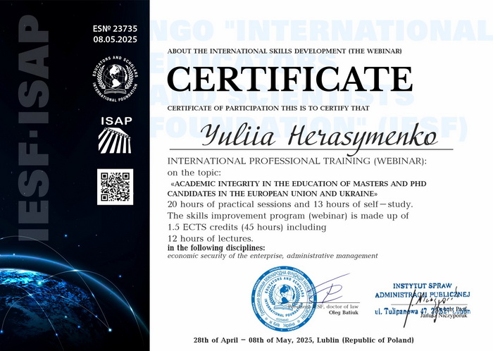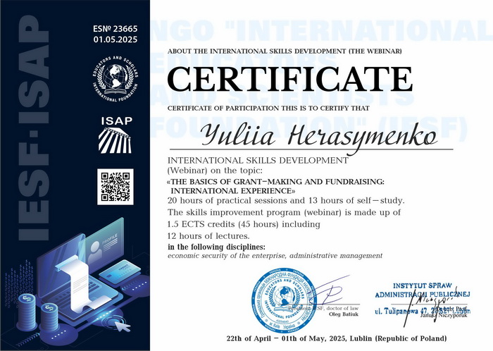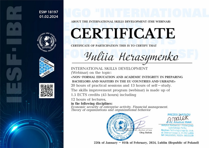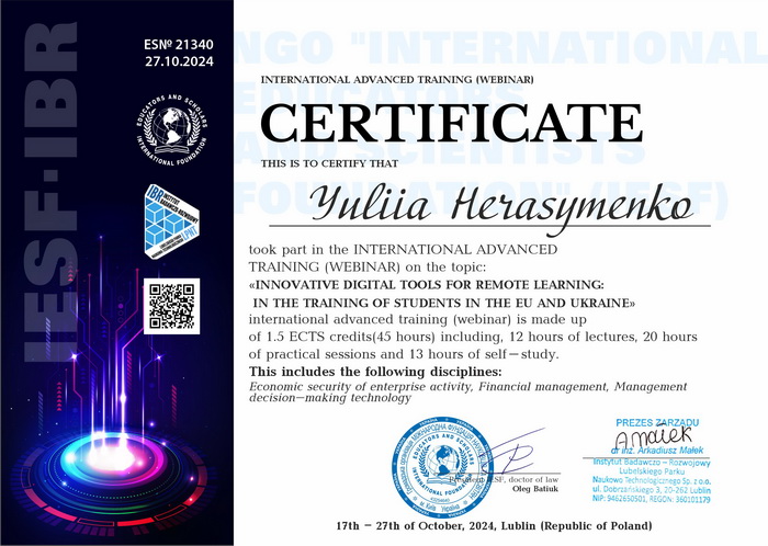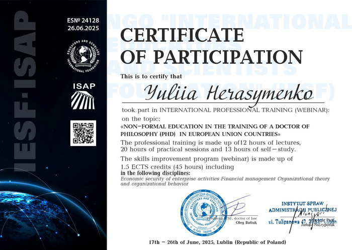 Організатором міжнародного підвищення кваліфікації (Вебінару) є Інститут Науково-дослідний Люблінського науково-технологічного парку та IESF «Міжнародна фундація науковців та освітян».