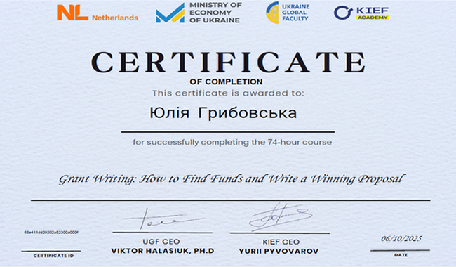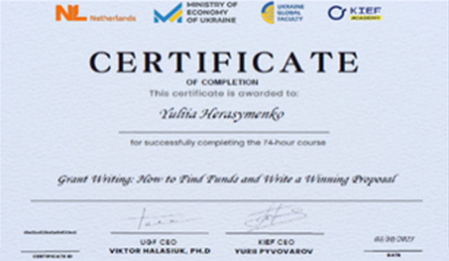 Із 3 грудня 2021 року по 20 січня 2022 року старша викладачка кафедри Наталія Бабченко взяла участь у ІІІ Міжнародній програмі підвищення кваліфікації керівників закладів освіти і науки, а також педагогічних і науково-педагогічних працівників на тему «Нобелівський курс: Нові знання, Ідеї, Досвід, Цінності, Компетентності» та отримала сертифікати обємом 180 год. / 6 кредитів ECTS. Організатор стажування – International Historical Biographical Institute (Dubai – New York – Rome – Jerusalem – Beijing)