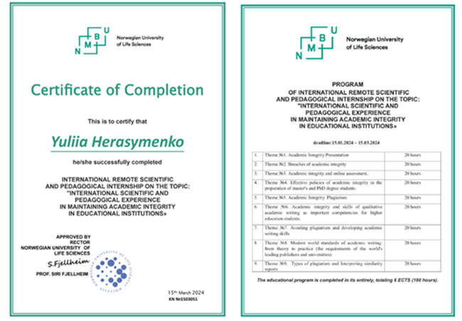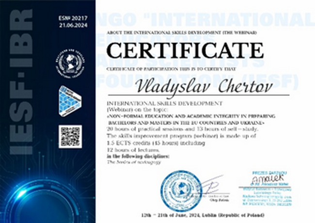 Із 20 по 27 червня 2022 року 10 науково-педагогічних працівників кафедри пройшли міжнародне підвищення кваліфікації на тему «Академічна доброчесність при підготовці бакалаврів в країнах Європейського союзу та України» та отримали відповідні сертифікати об’ємом 45 год. / 1,5 кредита ECTS. Учасники стажування: проф. Вікторія Сидоренко, доц. Володимир Кулішов, доц. Оксана Рудич, ст. викл. Вікторія Баркар, ст. викл. Валентина Борзенкова, ст. викл. Віра Харагірло, доц. Алла Лукіянчук, ст. викл. Наталія Бабченко, доц. Наталія Торба, проф. Микола Максимов.