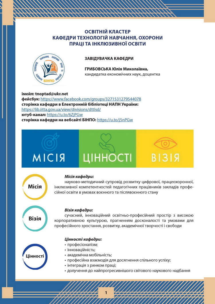 КАФЕДРА ТЕХНОЛОГІЙ НАВЧАННЯ, ОХОРОНИ ПРАЦІ ТА ІНКЛЮЗИВНОЇ ОСВІТИ DEPARTMENT OF TRAINING TECHNOLOGIES, LABOR SAFETY AND INCLUSIVE EDUCATION