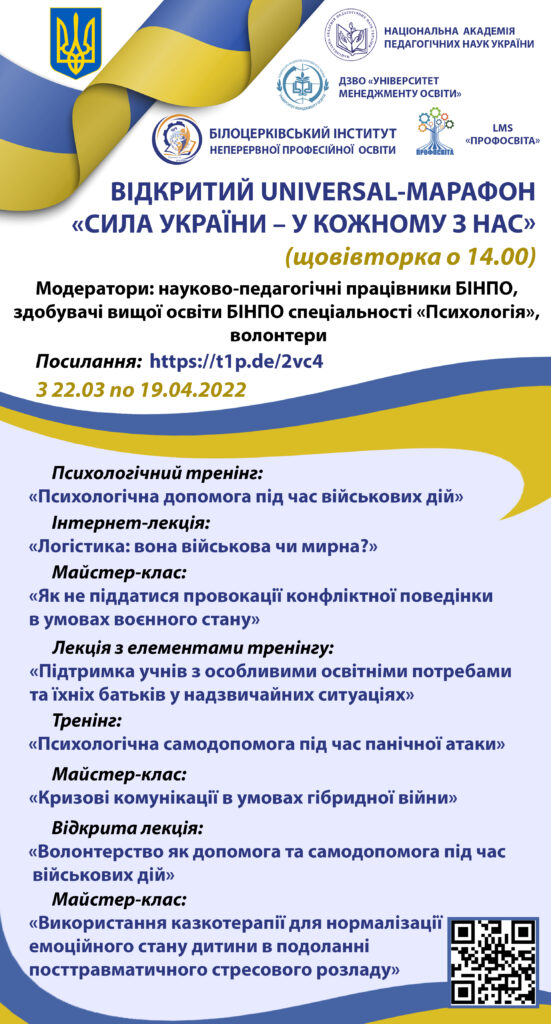 ШАНОВНІ КОЛЕГИ!БАТЬКИ, ОСОБИ, ЯКІ ПОСТРАЖДАЛИ ПІД ЧАС ВОЄННИХ ДІЙ!Із 23.03.2022 року при Білоцерківському інституті...