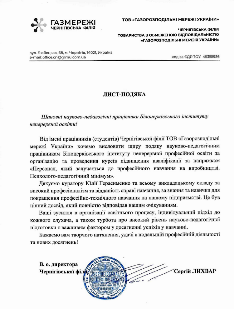 ПОДЯКА ВІД ТЕРНОПІЛЬСЬКОЇ ФІЛІЇ ТОВ «ГАЗОРОЗПОДІЛЬНІ МЕРЕЖІ УКРАЇНИ»