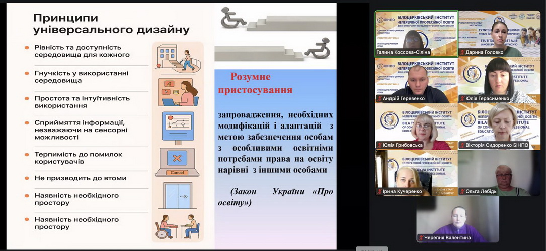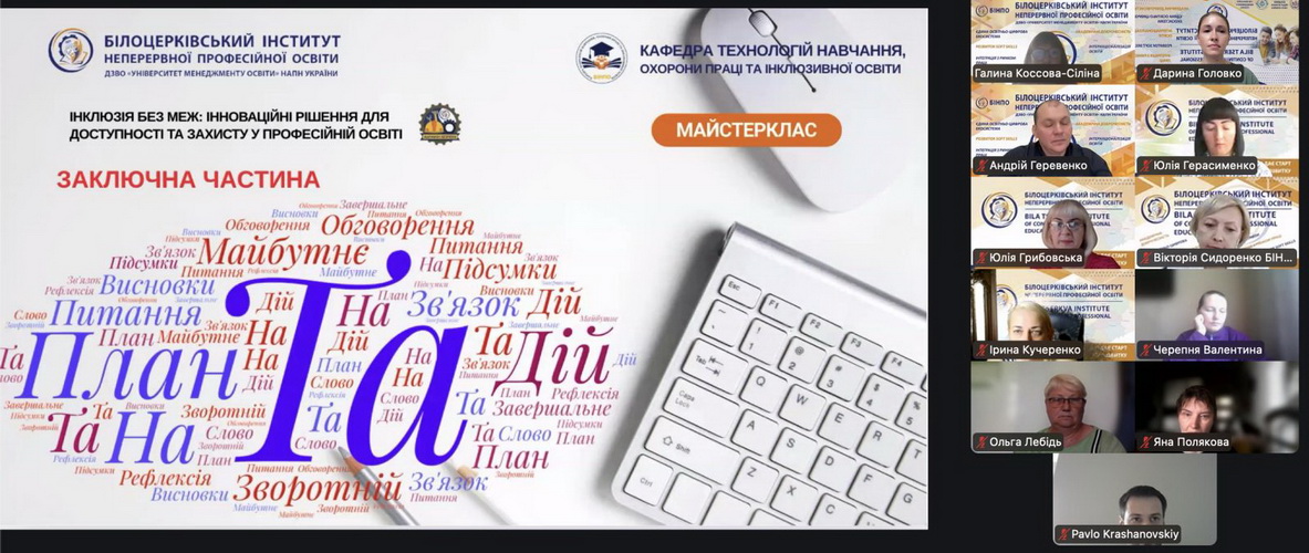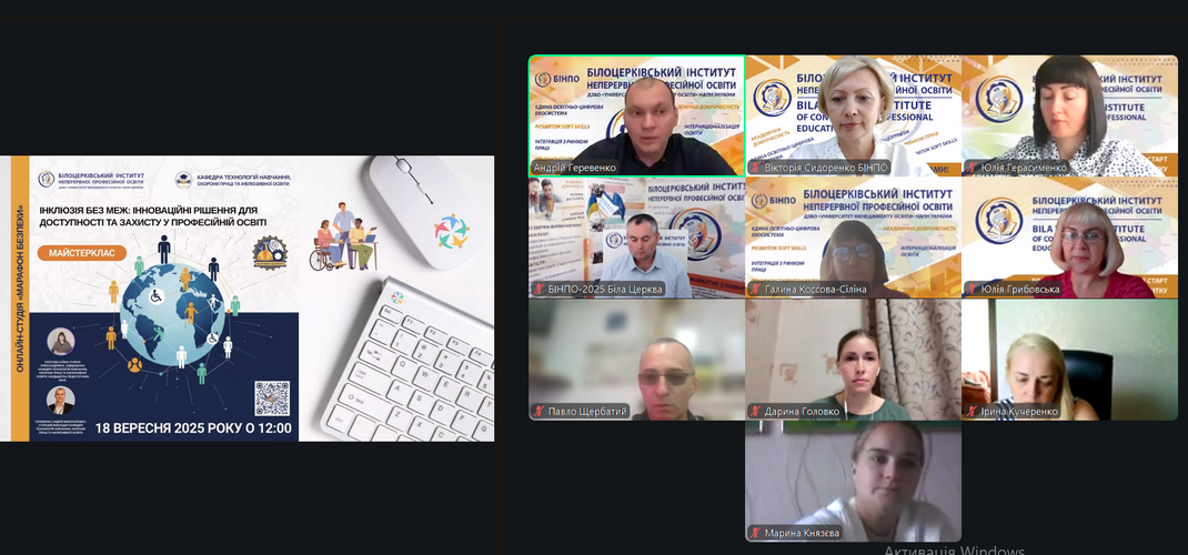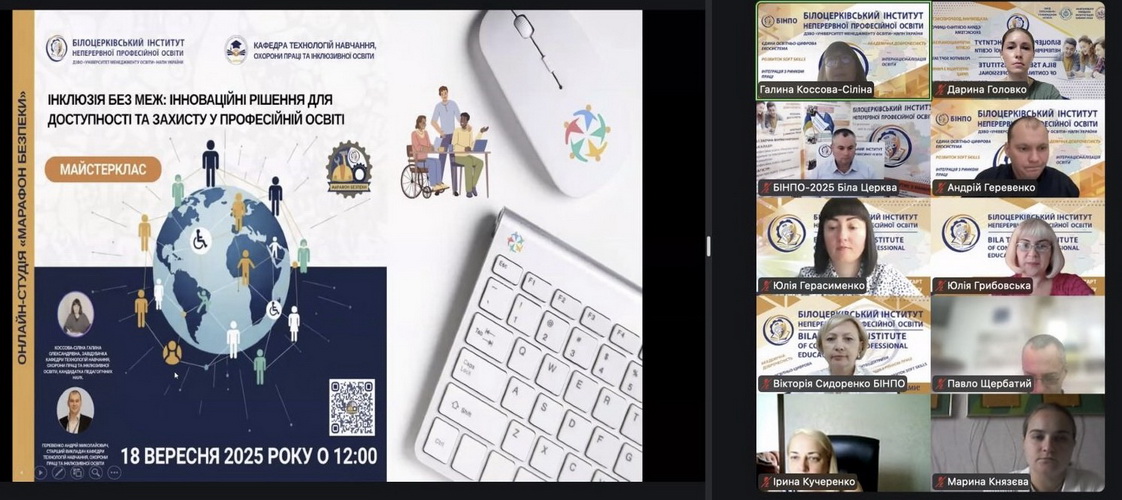 18 вересня 2025 року у Білоцерківському інституті неперервної професійної освіти ДЗВО «УМО» НАПН України відбувся майстерклас на тему: «Інклюзія без меж: інноваційні рішення для доступності та захисту в професійній освіті» у межах планового засідання онлайн-студії «Марафон безпеки».