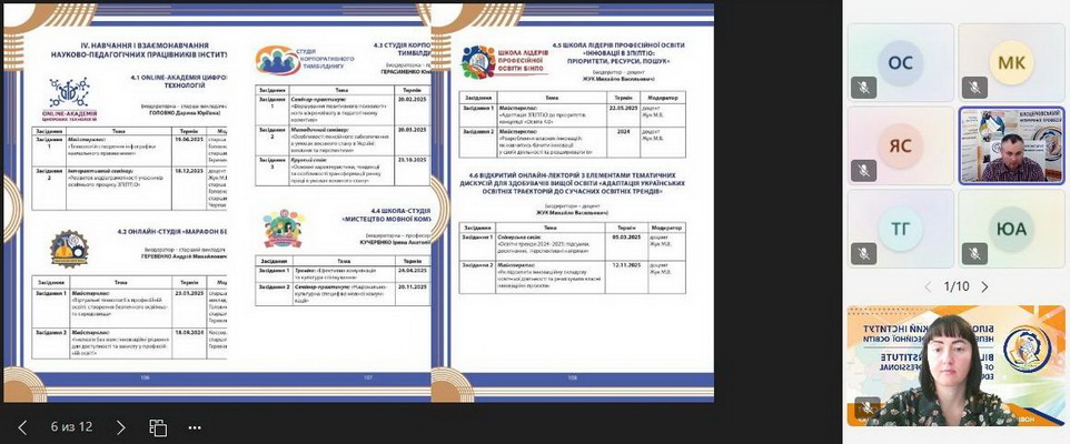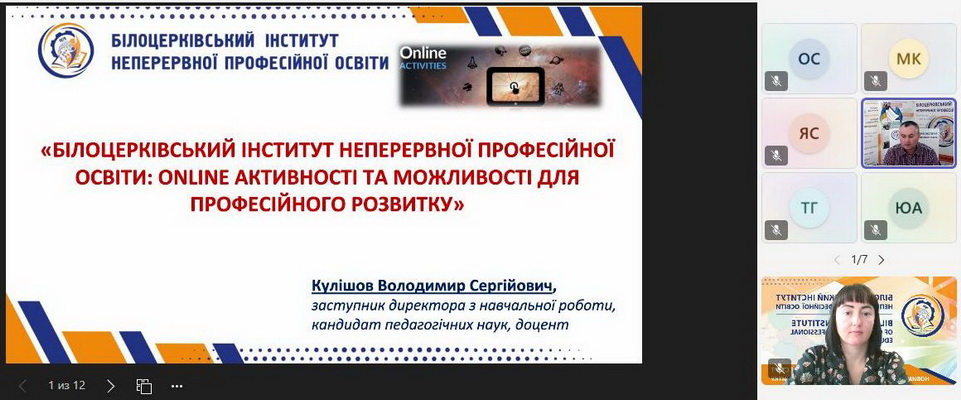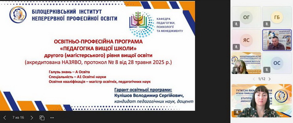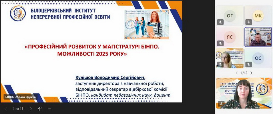 Володимир Кулішов, заступник директора з навчальної роботи, кандидат педагогічних наук, доцент, звернув увагу учасників зустрічі на можливості БІНПО для забезпечення професійного зростання і розвитку фахової компетентності педагогічних працівників ЗП(ПТ)О. Володимир Сергійович ознайомив присутніх із важливими та корисними матеріалами для слухачів курсів підвищення кваліфікації, що представлені на офіційному сайті БІНПО: рубрика «Слухачам КПК», План роботи БІНПО на 2025 рік, План-графік підвищення кваліфікації педагогічних працівників державних ЗП(ПТ)О, Цифрова бібліотека БІНПО. Володимир Кулішов наголосив на важливості і можливості навчання у магістратурі БІНПО й ознайомив з освітніми програмами для навчання на другому (магістерському) рівні вищої освіти (ОПП «Педагогіка вищої школи, ОПП «Психологія»), особливостями вступної кампанії у 2025 році.