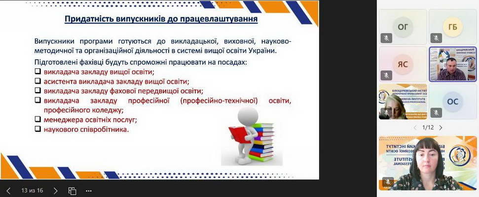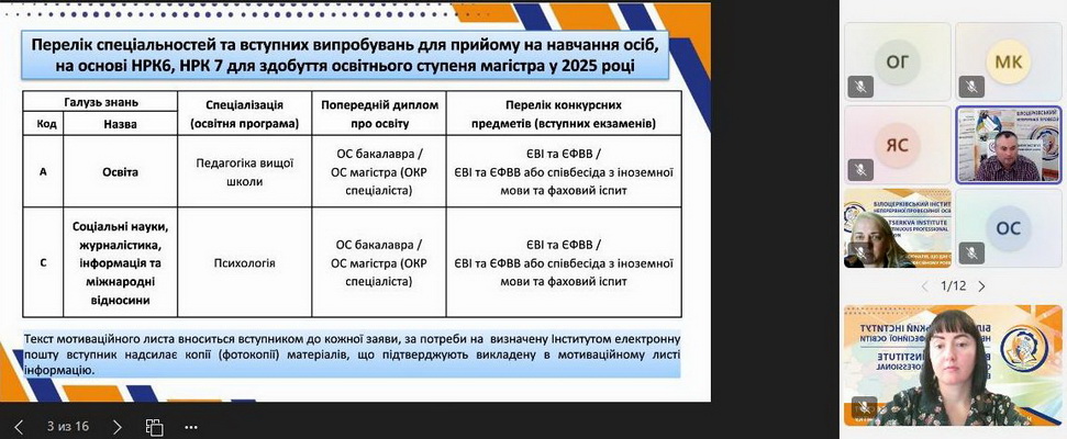 Інформаційну зустріч проводили спікери: Вікторія Сидоренко, директорка БІНПО, докторка педагогічних наук, професорка; Володимир Кулішов, заступник директора з навчальної роботи, кандидат педагогічних наук, доцент; Ірина Кучеренко, вчений секретар БІНПО, докторка педагогічних наук, професорка; Галина Коссова-Сіліна, завідувачка кафедри технологій навчання, охорони праці та інклюзивної освіти, кандидатка педагогічних наук, доцентка; Юлія Герасименко, завідувачка кафедри педагогіки, психології та менеджменту, докторка економічних наук, доцентка.