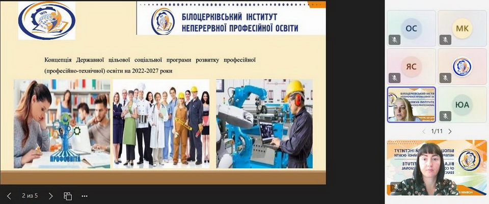 Ірина Кучеренко, вчений секретар БІНПО, докторка педагогічних наук, професорка, звернула увагу слухачів курсів на провідну роль вітчизняної професійно-технічної освіти в умовах воєнного стану та для повоєнного відновлення України. Ірина Анатоліївна зазначила, що модернізація закладів професійної (професійно-технічної) освіти передбачає створення передумов для реалізації профільної середньої освіти професійного спрямування і нині відбувається розробка актуальних та необхідних модельних програм профільного навчання.