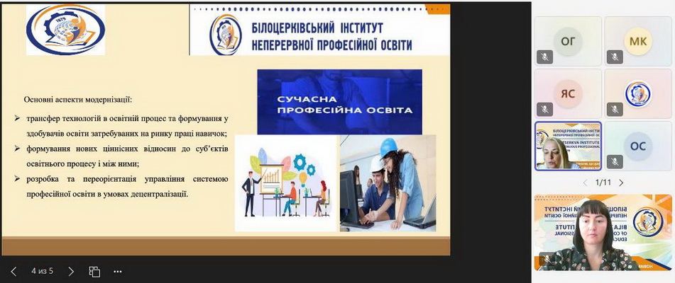 Юлія Герасименко, завідувач кафедри педагогіки, психології та менеджменту, презентувала учасникам систему діяльності кафедри (освітній, методичний, науковий і організаційний напрями), що покликані підвищувати професійну компетентність педагогічних працівників ЗП(ПТ)О нової генерації.
