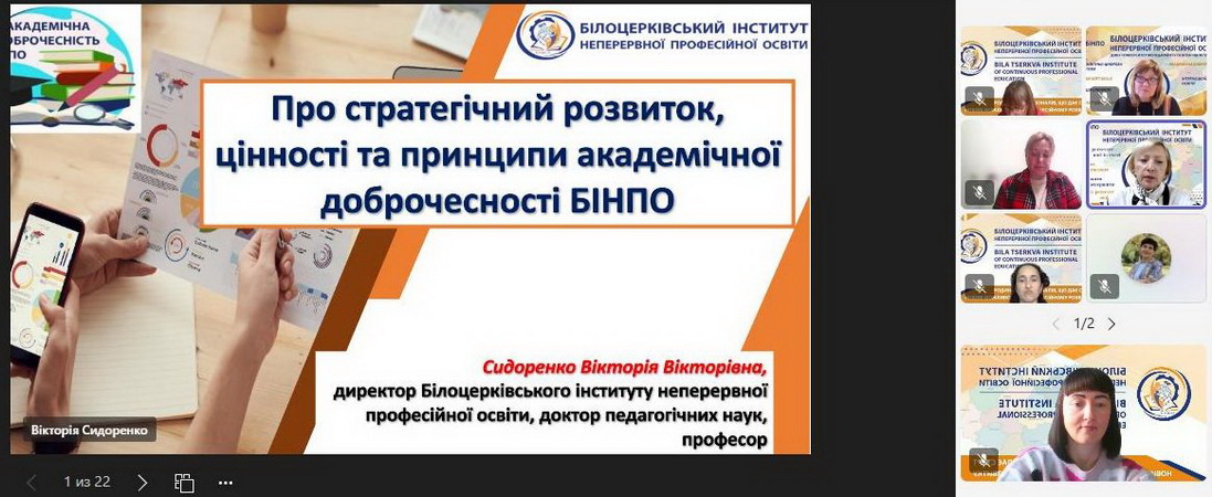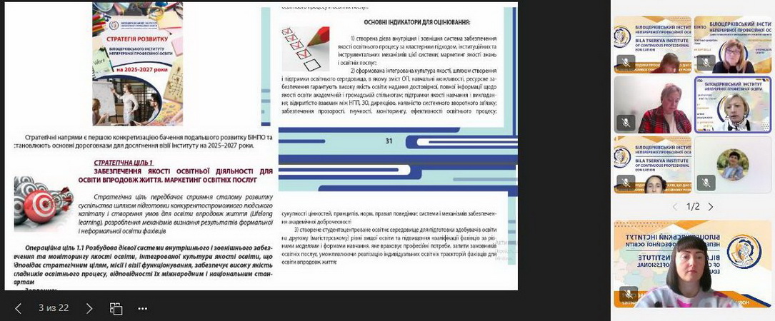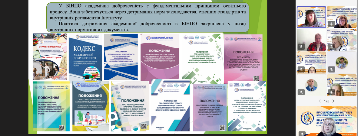 - Про стратегічний розвиток, цінності та принципи академічної доброчесності БІНПО відповідно до нової редакції Стратегії розвитку Білоцерківського інституту неперервної професійної освіти на 2025-2027 роки та Положення про академічну доброчесність у Білоцерківському інституті неперервної професійної освіти.