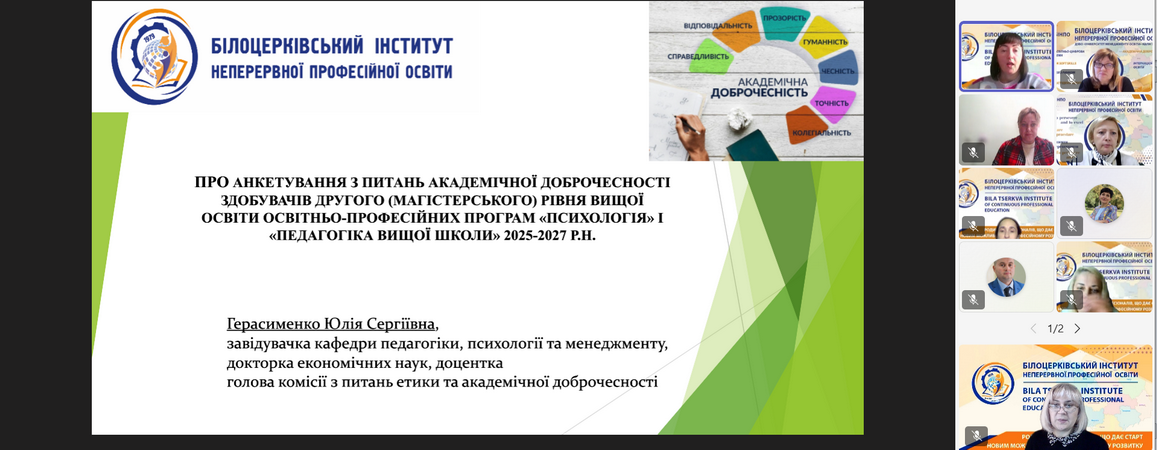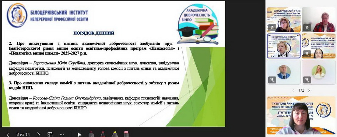 Модерувала засідання Юлія Герасименко, голова Комісії з питань етики та академічної доброчесності БІНПО, завідувачка кафедри педагогіки, психології та менеджменту, докторка економічних наук, доцентка.