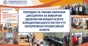 Відповідно до розділу Х статті 62 Закону України «Про вищу освіту» вибіркові дисципліни – дисципліни вільного вибору студентів для певного рівня вищої освіти, спрямовані на забезпечення загальних та спеціальних (фахових) компетентностей за спеціальністю. Це дисципліни, які вводяться кафедрами Білоцерківського інституту неперервної професійної освіти з метою задоволення освітніх і кваліфікаційних потреб здобувачів, формування soft skills, посилення ı̈х конкурентоспроможності та затребуваності на ринку праці, а також ефективного використання можливостей БІНПО, урахування регіональних потреб, інтересів стейкголдерів тощо. Обсяг вибіркових навчальних дисциплін становить не менше 25% від загальної кількості кредитів ЄКТС, передбачених для відповідного рівня освіти.