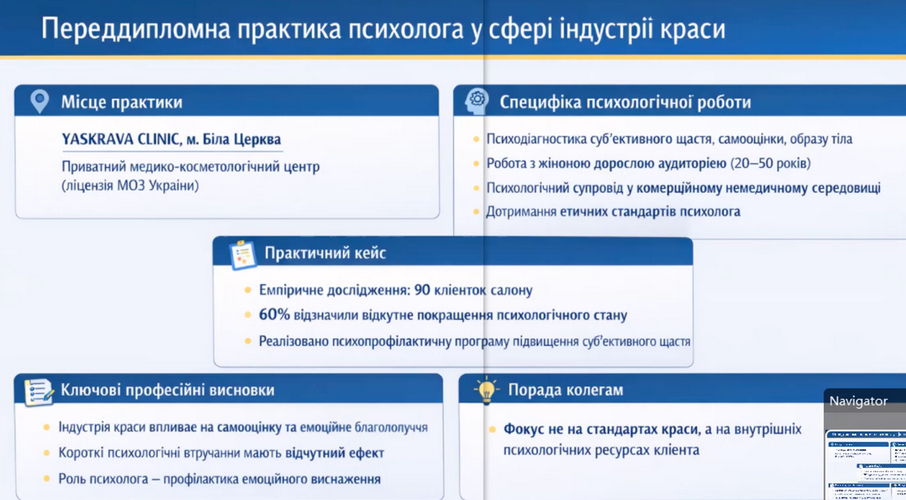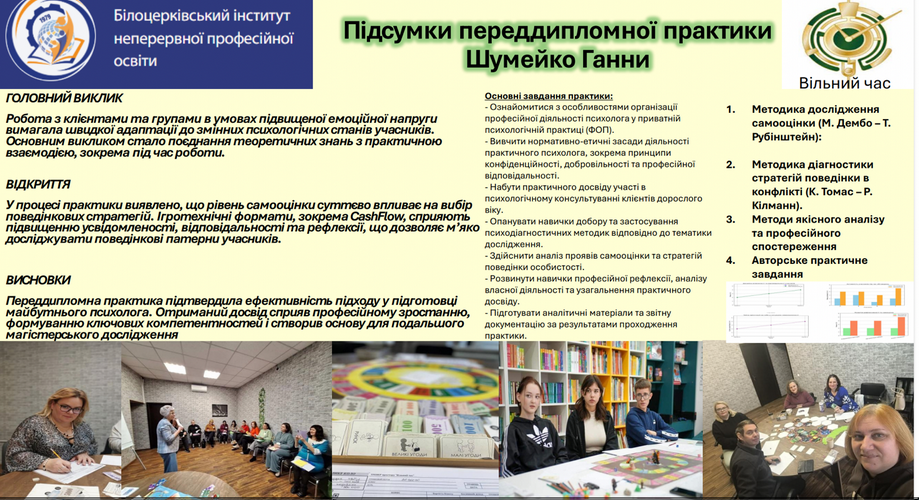 Конференція стала платформою для професійної рефлексії, обміну досвідом та презентації результатів переддипломної практики – ключового етапу у становленні майбутніх психологів-практиків. Це була можливість не лише представити результати своєї роботи, але й осмислити власний професійний шлях, почути досвід колег та отримати фахову оцінку від комісії.