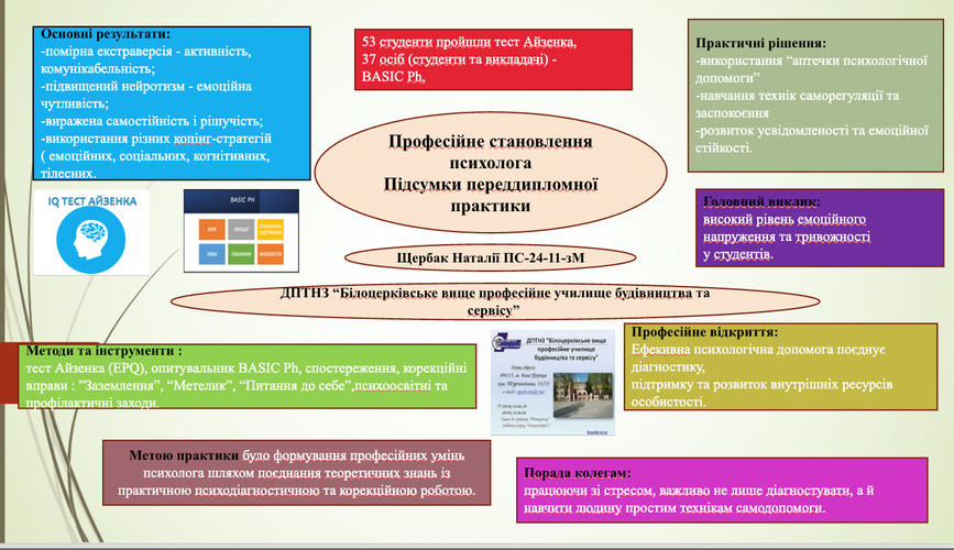 Переддипломна практика магістрантів була спрямована на вирішення комплексу професійних завдань: практичне застосування теоретичних знань у роботі з реальними клієнтами, розвиток особистісних якостей психолога (емпатії, рефлексивності, стресостійкості), формування професійних компетентностей (комунікативних, діагностичних, аналітичних), засвоєння сучасних методів групової та індивідуальної психологічної роботи, а також розвиток навичок професійної рефлексії і самоаналізу. Магістранти проходили практику в різноманітних установах: закладах освіти, центрах психологічної допомоги, медичних установах, організаціях та приватних практиках.