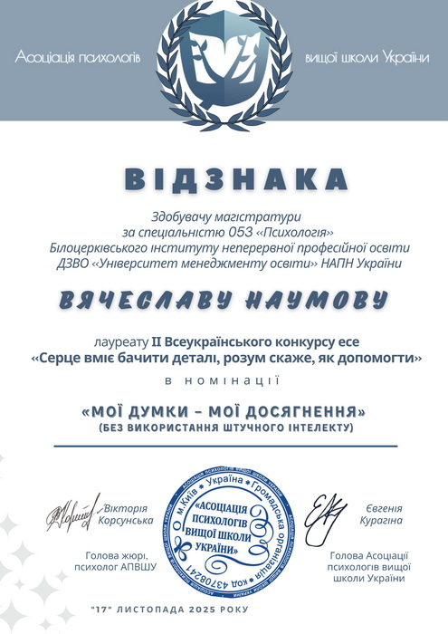 Вячеслав Наумов, здобувач ІІ курсу ОП «Психологія», став лауреатом Всеукраїнського конкурсу в номінації «Мої думки – мої досягнення». Вячеслав Петрович – сертифікований фахівець з методу відновлення після втрат, психосоціальної програми, що надає прості покрокові дії, які повертають до життя без емоційного болю втрат. Сертифікований на проведення психосоціальної програми «Діти та війна. Навчання технік зцілення» для дітей та дорослих, що пропонує техніки у роботі з симптомами ПТСР на початковій стадії або профілактики ПТСР.