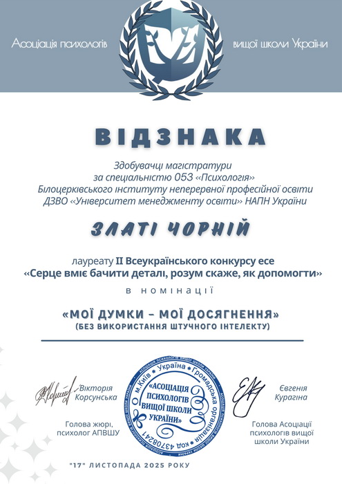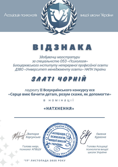 Злата Чорна, здобувачка І курсу ОП «Психологія», стала лауреаткою Всеукраїнського конкурсу в трьох номінаціях: «Натхнення», «Мої думки – мої досягнення», «Самобутність міркувань». Професійний шлях Злати Павлівни складався поступово: спершу була педагогіка – як уміння чути й пояснювати, згодом бізнес – як досвід відповідальності за рішення. Уже понад двадцяти років працює в соціальній сфері, поруч із сім’ями, які потребують підтримки. У цій роботі для важливі не гучні формулювання, а точність дій, уважність і відповідальне ставлення до кожної ситуації. Злата Чорна любить спостерігати за людьми. За тим, що вони говорять, і ще більше – за тим, про що мовчать. Саме це спостереження, неквапне й уважне, привело до рішення здобути освіту психолога у БІНПО – щоб краще розуміти внутрішні процеси людини. Серед захоплень – англійська мова та написання текстів.