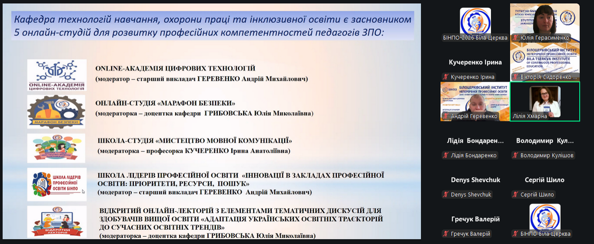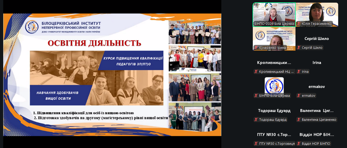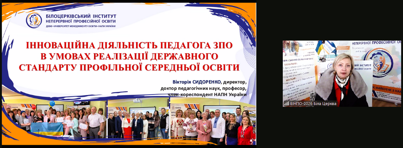20 січня 2026 року у Білоцерківському інституті неперервної професійної освіти ДЗВО «Університет менеджменту освіти» НАПН України відбулася інформаційна зустріч зі слухачами курсів підвищення кваліфікації на тему: «Інноваційна діяльність педагога ЗПО в умовах реалізації Державного стандарту профільної середньої освіти».