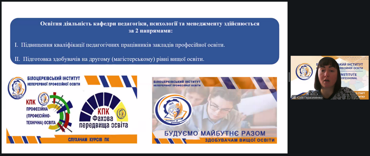 Юлія Герасименко, завідувачка кафедри педагогіки, психології та менеджменту, докторка економічних наук, доцентка, у своєму виступі представила цілісну систему діяльності кафедри, зосередивши увагу на освітньому, методичному, науковому й організаційному напрямах роботи. Вона акцентувала увагу на їх значенні у формуванні професійної компетентності педагогічних працівників закладів професійної освіти нового покоління, а також ознайомила слухачів із основними здобутками кафедри та перспективними планами її розвитку на 2026 рік.
