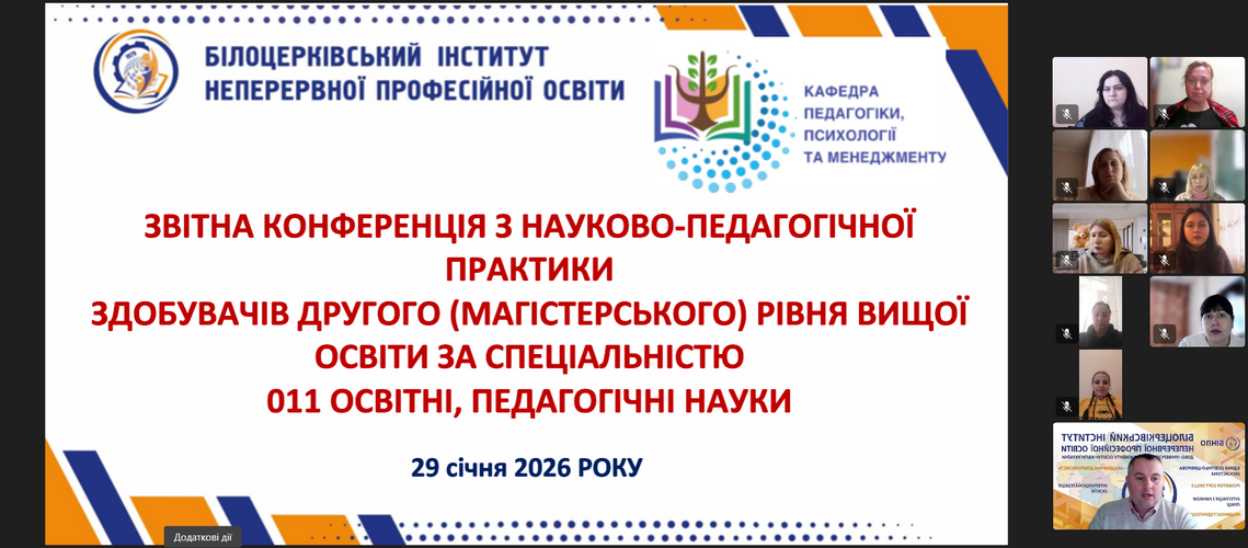 29 січня 2026 року у Білоцерківському інституті неперервної професійної освіти ДЗВО «УМО» НАПН України відбулася звітна конференція з науково-педагогічної практики здобувачів другого (магістерського) рівня вищої освіти за спеціальністю 011 Освітні, педагогічні науки.