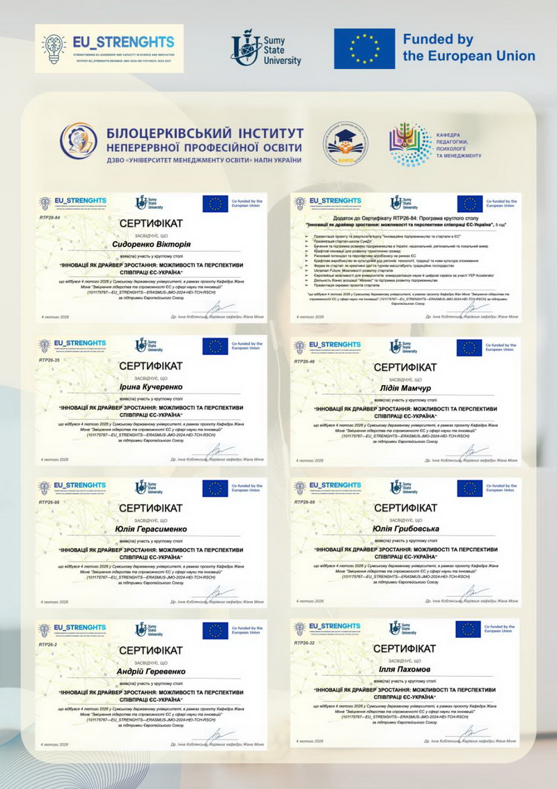 04 лютого 2026 року науково-педагогічні працівники Білоцерківського інституту неперервної професійної освіти ДЗВО «УМО» НАПН України взяли участь у круглому столі «Інновації як драйвер зростання – можливості та перспективи співпраці ЄС-Україна».