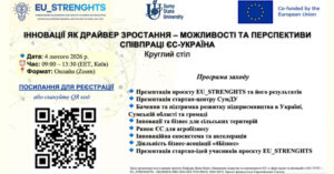 Захід організовано в рамках проєкту Кафедра Жана Моне «Зміцнення лідерства та спроможності ЄС у сфері науки та інновацій» (101175767—EU_STRENGHTS—ERASMUS-JMO-2024-HEI-TCH-RSCH), що фінансується Європейським Союзом. Керівник проєкту – Інна Коблянська, к.е.н., доцент кафедри економіки, підприємництва та бізнес-адміністрування Сумського державного університету.