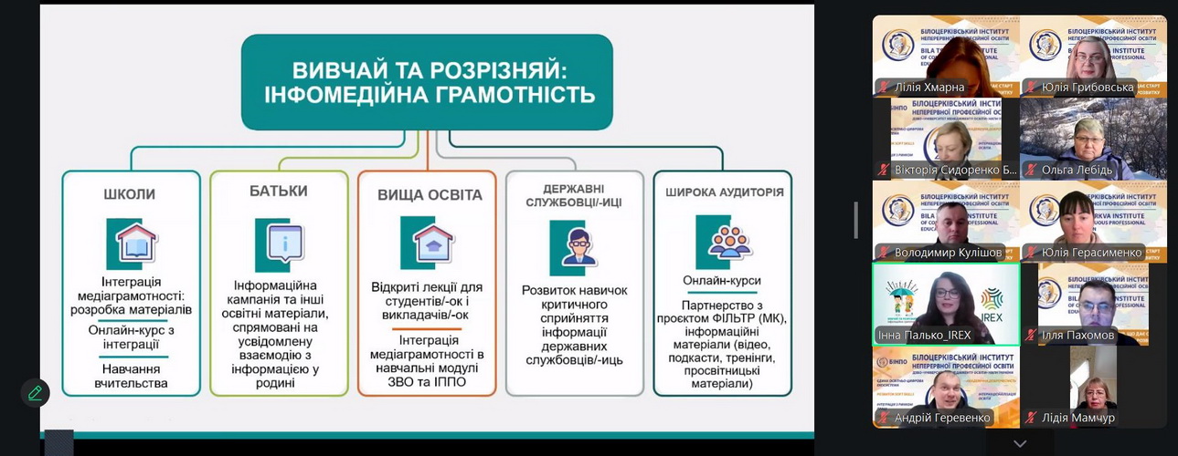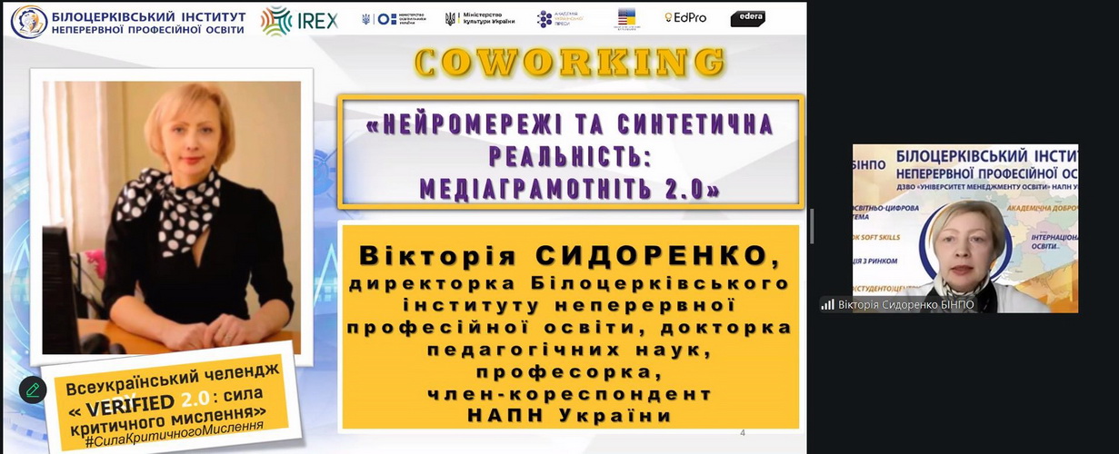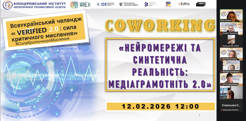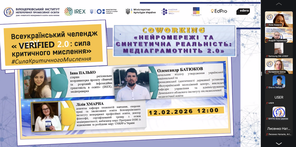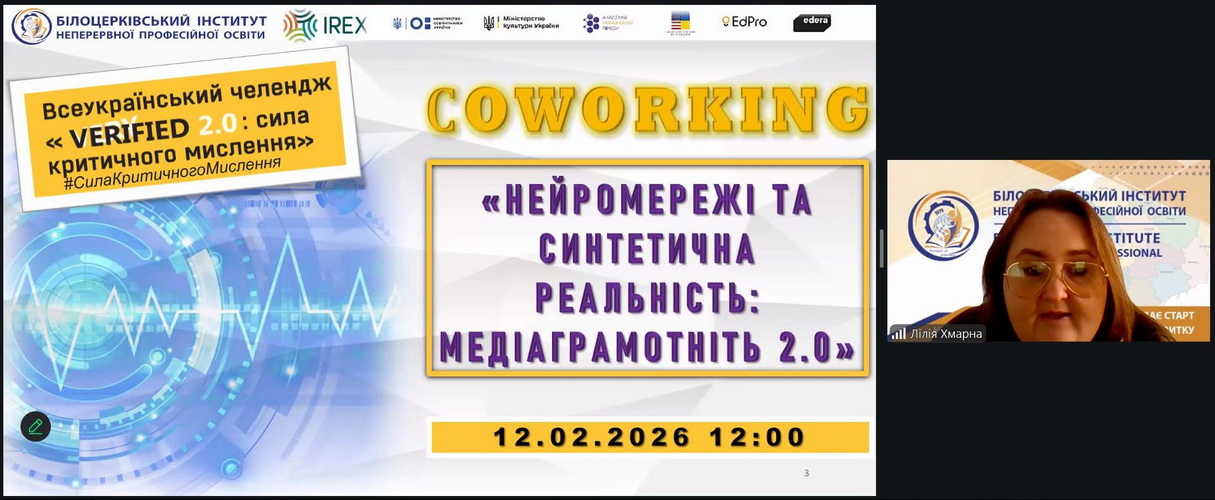 12 лютого 2026 року у Білоцерківському інституті неперервної освіти ДЗВО «Університет менеджменту освіти» НАПН України проведено коворкінг «Нейромережі та синтетична реальність: медіаграмотність 2.0». Захід зреалізовано у рамках масштабного Всеукраїнського челенджу «Very Verified 2.0: Сила критичного мислення», організованого міжнародною організація IREX за підтримки Посольства США в Україні, спільно зі студією онлайн-освіти EdEra, у партнерстві з Міністерством освіти і науки України, Міністерством культури та інформаційної політики України, Академією української преси.