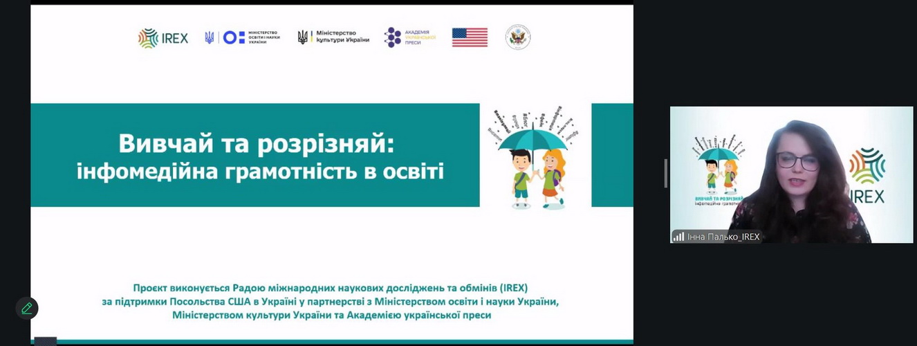 Інна Палько, старша регіональна координаторка проєкту «Вивчай та розрізняй: інфомедійна грамотність в освіті» (IREX), медіатренерка у своєму виступі наголосила, що проєкт охоплює широку аудиторію, не лише викладачів історії чи української мови, а й педагогів різних предметів, адже медіаграмотність інтегрується у всі сфери освіти. Вона презентувала інноваційні й практичні інструменти, серед яких: