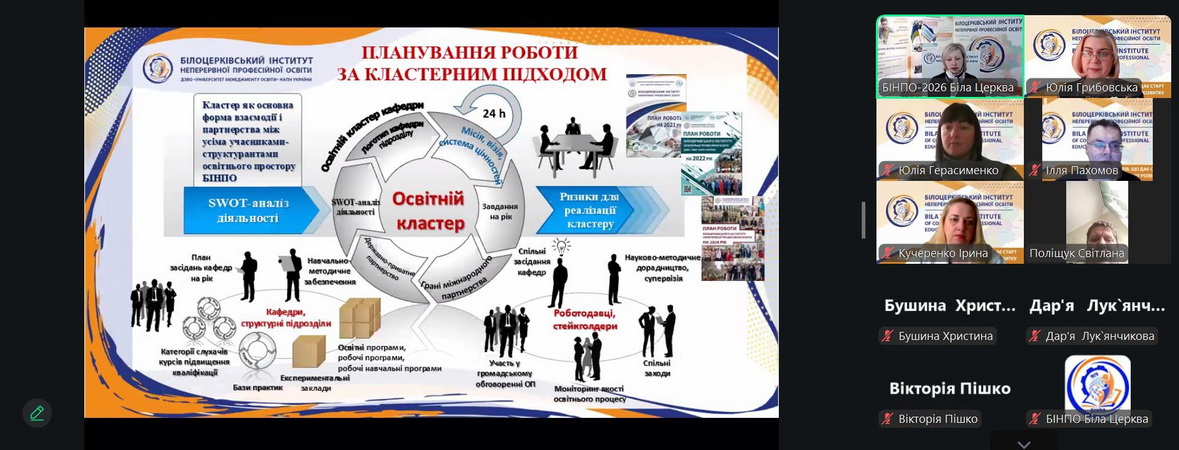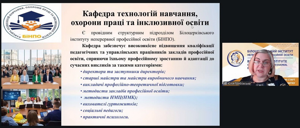 Юлія Грибовська презентувала діяльність кафедри технологій навчання, охорони праці та інклюзивної освіти, окреслила її кадровий потенціал і завдання освітнього кластеру. Учасники ознайомилися з навчально-методичним забезпеченням курсів підвищення кваліфікації, планом науково-методичних заходів на 2026 рік, а також із програмами короткострокового навчання та процедурою реєстрації свідоцтв у єдиній атестаційній системі.