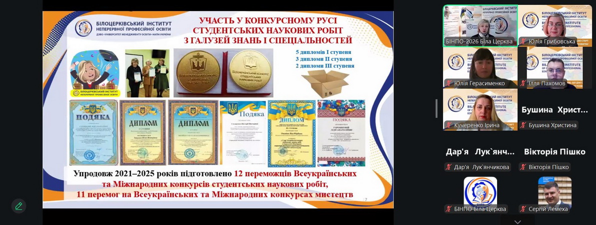 Юлія Герасименко представила напрями роботи освітнього кластеру кафедри педагогіки, психології та менеджменту, охарактеризувала ресурси для неформальної освіти та професійного розвитку, презентувала пропозиції короткострокових програм підвищення кваліфікації на 2026 рік. Також було відзначено досягнення здобувачів вищої освіти, які отримали нагороди та грамоти.