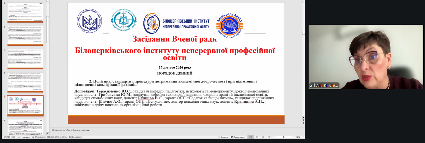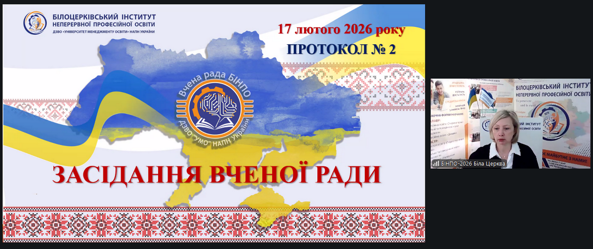17 лютого 2026 року відбулося планове засідання Вченої ради Білоцерківського інституту неперервної професійної освіти ДЗВО «Університет менеджменту освіти» НАПН України.
