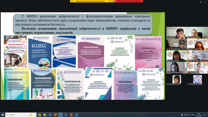 У процесі розгляду питання «Політика, стандарти і процедури дотримання академічної доброчесності при підготовці і підвищенні кваліфікації фахівців» Юлія Герасименко, завідувачка кафедри педагогіки, психології та менеджменту, докторка економічних наук, доцентка, зазначила, що у БІНПО академічна доброчесність є фундаментальним принципом освітнього процесу, і забезпечується через дотримання норм законодавства, етичних стандартів та внутрішніх регламентів інституту. Юлія Грибовська, завідувачка кафедри технологій навчання, охорони праці та інклюзивної освіти, кандидатка економічних наук, доцентка, звернула увагу, що академічна доброчесність – це не лише юридична вимога, а й основоположна компетентність, що формує фахову етику та професійну культуру фахівців, і є фундаментальною цінністю сучасної освіти і науки. Володимир Кулішов, гарант ОПП «Педагогіка вищої школи», кандидат педагогічних наук, доцент, та Алла Клочко, гарант ОПП «Психологія», доктор психологічних наук, доцент, охарактеризували особливості забезпечення академічної доброчесності під час реалізації кожної освітньо-професійної програми й інформування здобувачів освіти про принципи академічної доброчесності, процедури перевірки робіт, наслідки порушень та ін. Альона Крапивіна, завідувачка відділу навчально-організаційної роботи, зауважила, що академічна доброчесність є основою академічного середовища, забезпечує побудову репутації та довіри, стимулює науковий розвиток, запобігає плагіату та порушенню авторських прав, ознайомила з основними елементи системи академічної доброчесності у БІНПО.