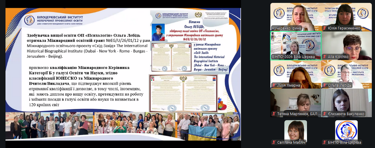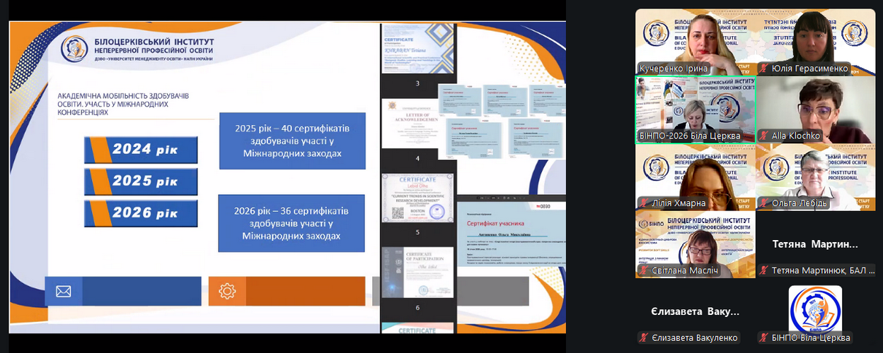 Юлія Герасименко, завідувачка кафедри педагогіки, психології та менеджменту, докторка економічних наук, доцентка, акцентувала увагу, що освітня діяльність здійснювалась в Інституті за двома напрямами (1. Підвищення кваліфікації для осіб із вищою освітою. 2. Підготовка здобувачів на другому (магістерському) рівні вищої освіти), охарактеризувала особливості її реалізації, зазначила, що освітній процес і наукова діяльність БІНПО ґрунтуються на академічній свободі учасників, свободі навчати і навчатися.