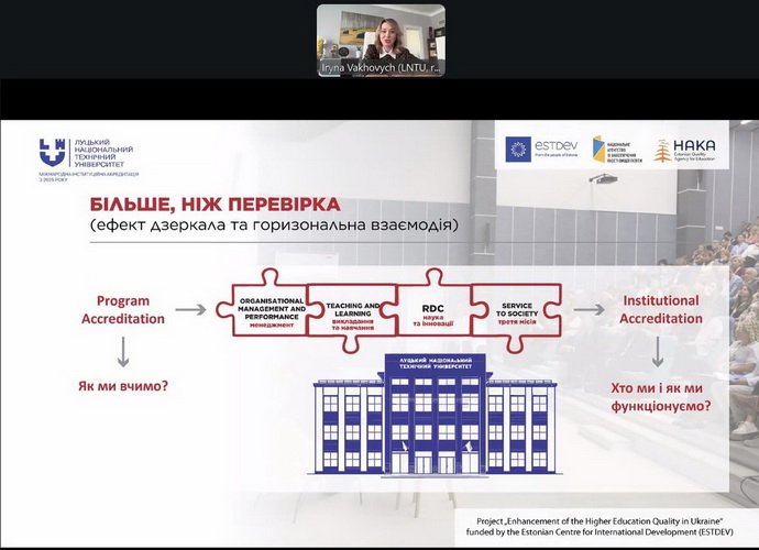 Ірина Вахович, ректор Луцького національного технічного університету, звернула увагу, що Міжнародна інституційна акредитація – це насамперед процедура зовнішнього оцінювання діяльності університету відповідно до європейських або світових стандартів якості вищої освіти (ESG – Standards and Guidelines for Quality Assurance in the European Higher Education Area). Вона охоплює: систему внутрішнього забезпечення якості освіти; освітні програми та їх відповідність міжнародним стандартам; академічну доброчесність; кадровий потенціал; наукову діяльність; міжнародну мобільність; управлінські процеси та стратегічний розвиток.
