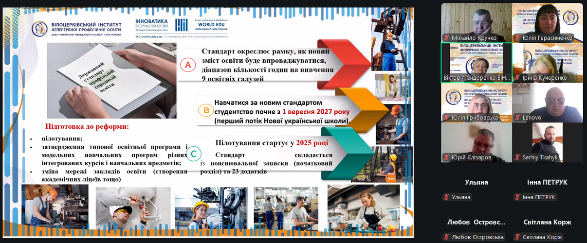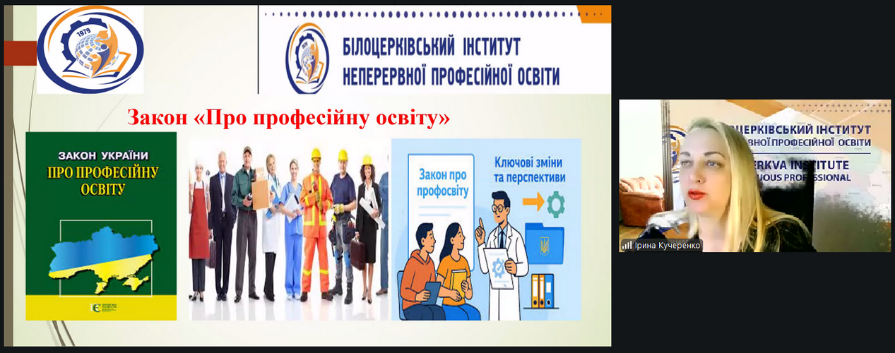 У своєму виступі Ірина Кучеренко висвітлила основні положення Закону України «Про професійну освіту», зосередивши увагу на можливостях запровадження профільної середньої освіти професійного спрямування в закладах професійної освіти. Вона також окреслила актуальні напрями модернізації галузі, підкресливши значення інноваційних підходів до організації освітнього процесу. Окрему увагу було приділено ключовим ідеям Концепції Державної цільової соціальної програми розвитку професійної освіти на 2022–2027 роки.