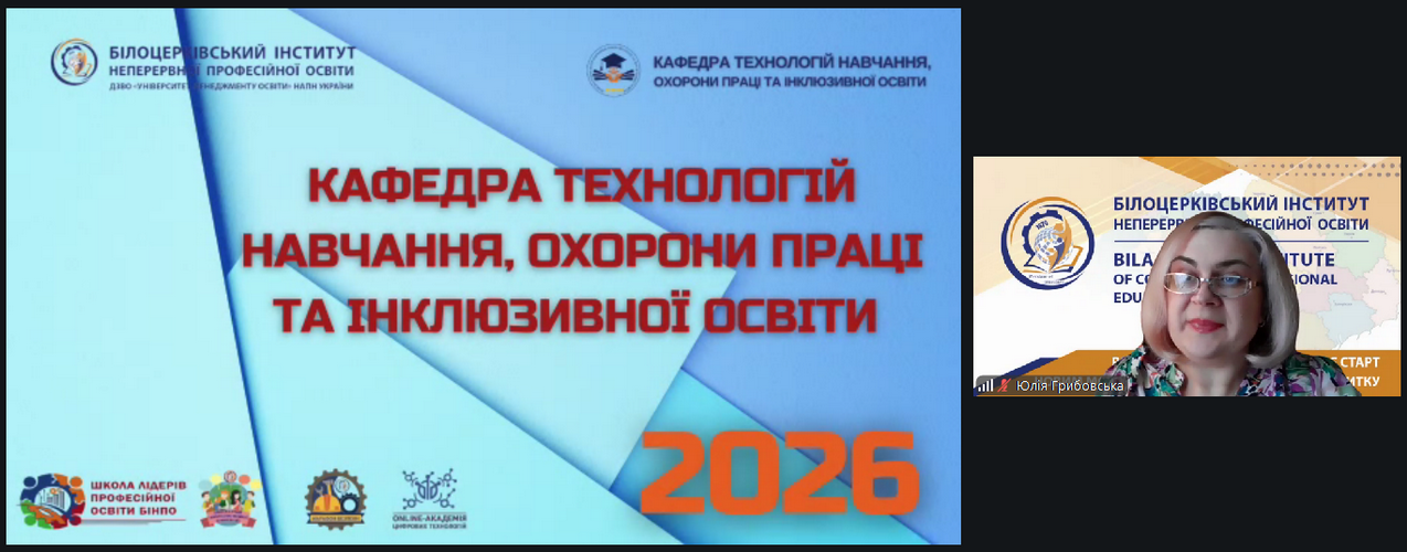 У своєму виступі Юлія Грибовська представила основні напрями діяльності кафедри технологій навчання, охорони праці та інклюзивної освіти, звернувши увагу на її кадровий потенціал та роль у розвитку освітнього кластеру. Учасників було поінформовано про навчально-методичне забезпечення курсів підвищення кваліфікації, заплановані на 2026 рік науково-методичні заходи, а також про можливості короткострокових програм навчання і порядок реєстрації свідоцтв у єдиній атестаційній системі.