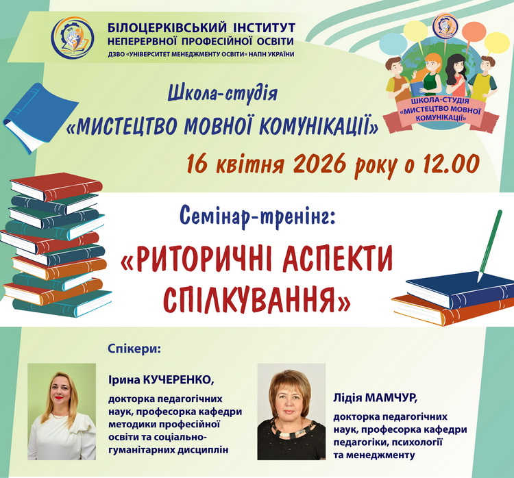 16 квітня 2026 року о 12.00 Білоцерківський інститут неперервної професійної освіти ДЗВО «УМО» НАПН України запрошує на семінар-тренінг: «Риторичні аспекти спілкування» у рамках засідання школи-студії «Мистецтво мовної комунікації».